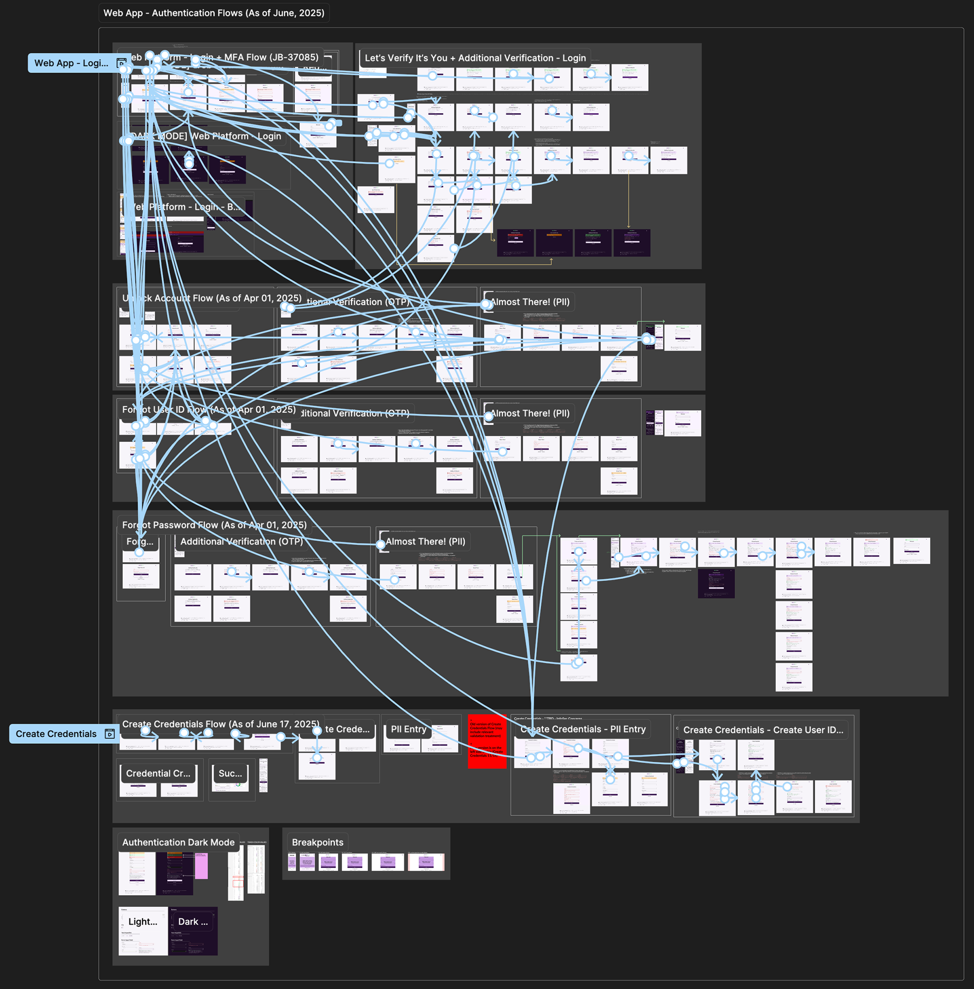 Account Summary and Authentication (Log In, Multi-factor Authentication, Forgot Password / User ID, Create Credential) screens and prototypes in Figma created by me leveraging Forje components