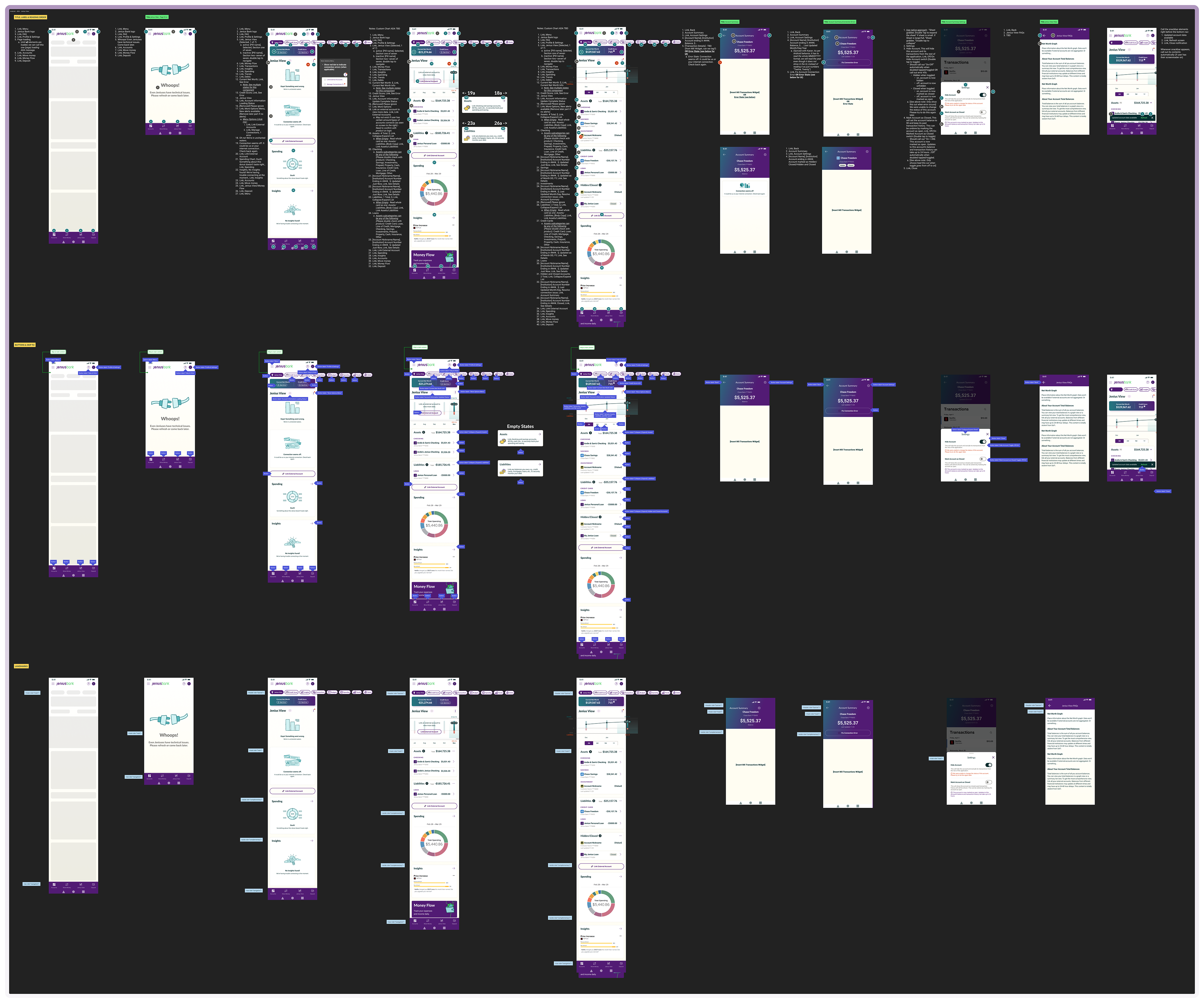 We were truly committed to creating accessible experiences at Jenius Bank. In our design work we aimed to meet the WCAG 2.2 standard on both the AA and AAA level. Above is an example of design-documented reading order, aria labels, landmarks, titles/headers, and button markers for our development team.