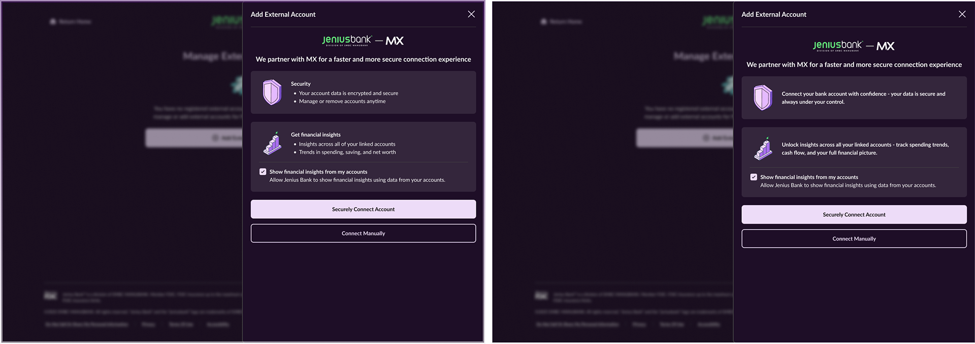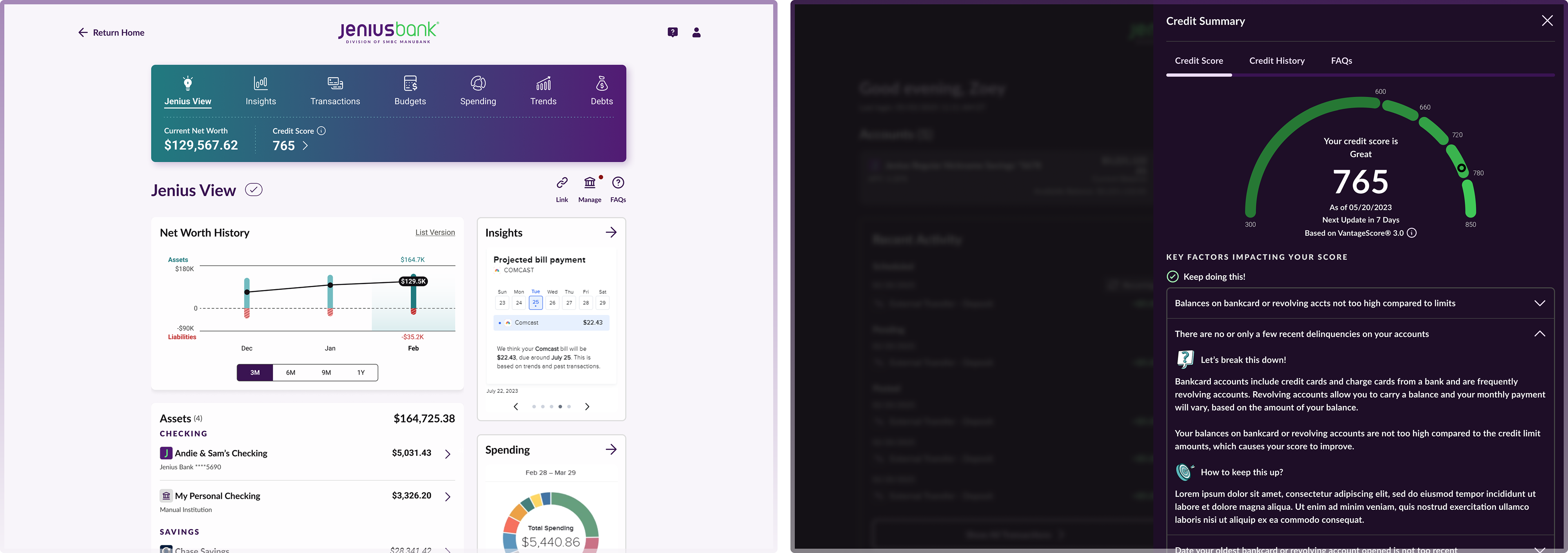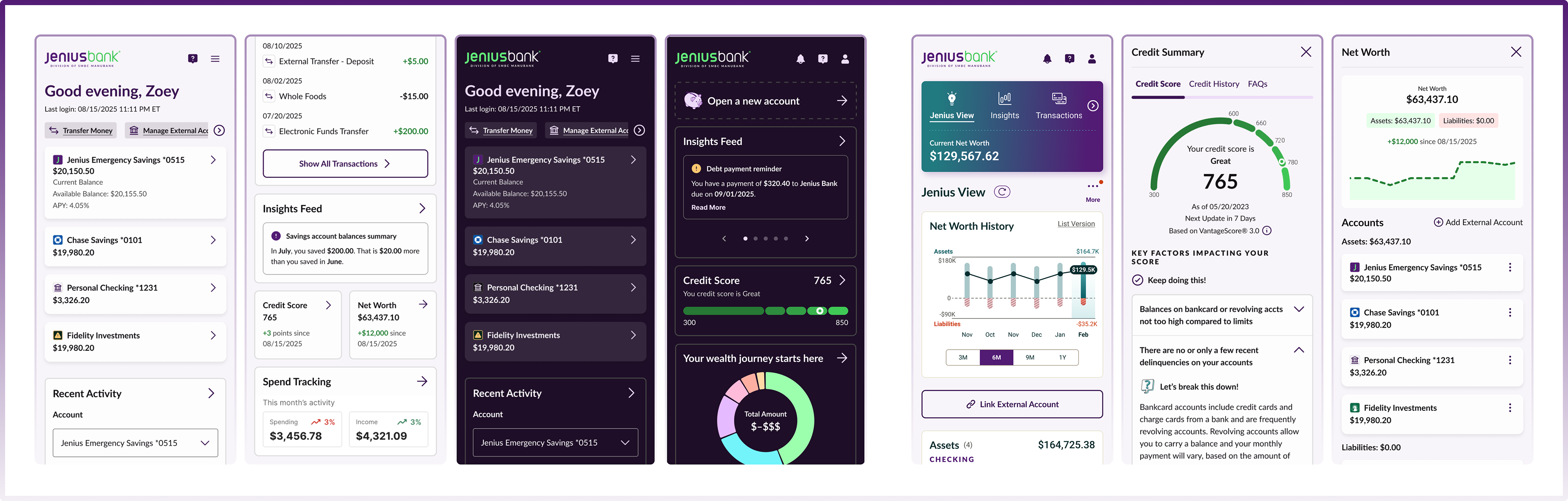 (I led design efforts for Jenius Bank’s Evolved work-stream across web and the MVP mobile app, which focused on features such as external account linking, net worth history with asset and liability breakdowns, credit score, enhanced transactions, subscription detection, cash flow forecast, spending data, FAQs, and personalized insights across internal and externally linked accounts.)
